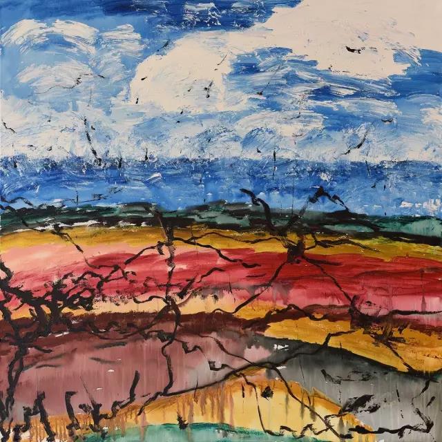 而她近期的一些畫作,在構圖和意境上都體現出變化和創新。比如一幅名為《大地滄?!返淖髌?,多種色彩并用,藍色的遠景讓人聯想到天空、大海,紅褐色的近景則是七彩大地的呈現。畫面中部網格狀的線條和凝重的黑色,很好地讓“大地滄?!钡闹黝}得到藝術的表現。滄桑中有時間歲月的饋贈,有具體和虛無的交匯,可以引領觀者的神思輕盈地飛翔。