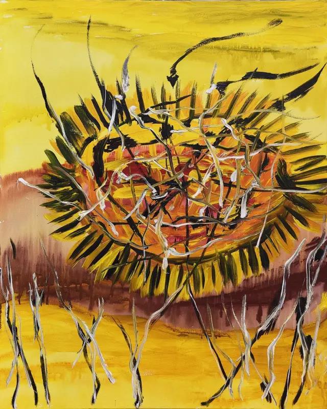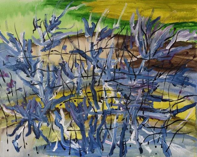 比如《繁花》,置于畫面遠景的山野和置近景的河流,和置于中景的“繁花”有平分秋色之嫌,構圖上稍顯局促。另一幅《凋零》,濃烈的色彩互相交織,凌亂的線條堆積于畫面中部,和“凋零”的主題略有背離感?!痘ㄎ戳饲椤分?,擁擠的花朵占據了畫面的全部,難免會讓視覺有太“滿”之感。