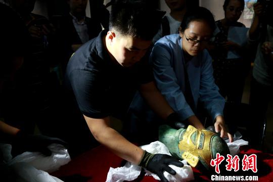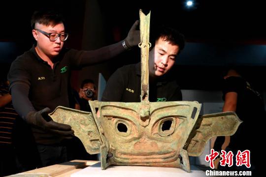 1986年三星堆遺址二號祭祀坑出土的銅戴冠縱目面具被工作人員仔細的開箱放入展臺。 梁犇 攝