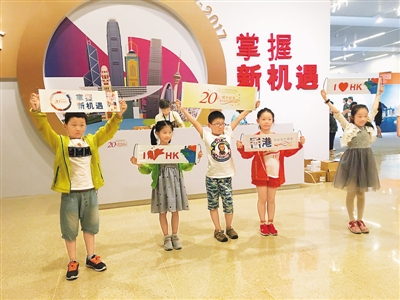 圖為前來參觀的小朋友們在展廳門口與慶祝香港回歸20周年的標語合影。