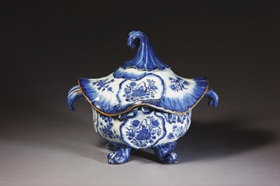 故宮藏清雍正青花葉紋開光花卉紋雙耳帶蓋湯盆。這是為適應歐洲人飲食習慣而特制的器皿,系歐洲國家定燒之物。