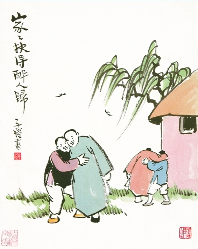 20世紀初期至21世紀初期近百年的歷史,中國現代人物畫與中國社會的發展基本保持著相同的脈動。20世紀初期,新的時代思潮沖擊封建舊文化,隱逸、遁世的文人畫觀念受到質疑,積極、入世的藝術得到提倡。以陳師曾、豐子愷、齊白石等人為代表的一批具有革新精神的藝術家沖出摹古的怪圈,以現實人物為表現對象,在人物畫中高歌紅塵悲歡,表現俗世情懷。他們的作品一掃傳統人物畫的孤高荒寒之氣,標志著中國畫由傳統向現代的轉型。此次展覽中來自北京畫院的齊白石藏品和上海中國畫院的豐子愷藏品,南北輝映,將觀眾帶入一個充滿人間情味的藝術世界。此次展出豐子愷的《家家扶得醉人歸》,描寫了兩對夫婦微醺相依的情態,畫面蕩漾著幸福祥和之氣。