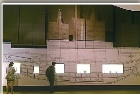 展覽的布置也試圖從形式上烘托統一帝國時代的開放與包容。在漢唐展廳上方,并以一盞圓燈暗示明月,高照在絲路駝隊和亭臺樓閣的剪影上,暗示著漢唐的陸上絲路。而在宋元展廳的末尾,則繪飾處揚帆起航的船體,一個個展柜窗口成了大船的舷窗,展示著遠銷海外的中華美器。讀萬卷書修心,行萬里路修道,這原本便是中華子民要歷練的滄桑。而陶瓷件件,便是他們步履不停,歷練出的模樣。