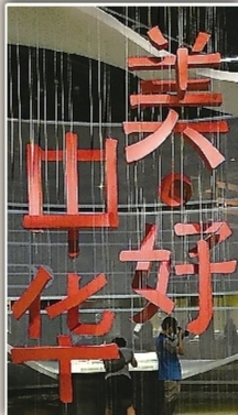 “復行數十步,豁然開朗”,“美·好中華”四個紅字懸置空中,細看文字,卻并非整體,而是用一個個筆畫模塊構成,既有立體的視效,又暗含隱喻。海德堡大學美術史家雷德侯在其名作《萬物》中曾提出,中國藝術的一大特色,就是模件化生產,從漢字到圖像,從兵馬俑到青花瓷,從青銅器到印刷術,概莫能外?!懊馈ず弥腥A”四字以筆畫模件構成,或許也希望以此形式,隱喻“美·好”背后的運作機巧和營造理念。圍繞著主題紅字,序廳半周陳列了此次展覽各個時代的代表性文物,來為觀眾預熱。在文物背后的薄幕背景上,播放著一個個飛升的文物圖像,飄飄然如文物的魂魄羽化登仙。