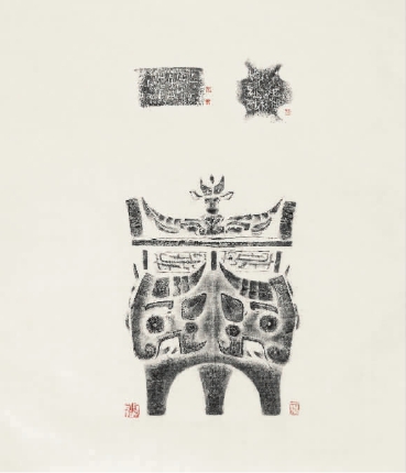 周希丁的弟子傅大卣繼承了他全形拓的技藝,而賈文忠正是師從于傅大卣的傳承人。自幼受家庭熏陶酷愛金石書畫的賈文忠十幾歲即隨父習業,深得銅器修復要領,又拜康殷、傅大卣等為師,學習金石篆刻、書畫、鑒定。他先后在北京市文物局、首都博物館、中國農業博物館從事文物保護、修復、鑒定、研究等工作近40年,修復過數千件青銅器,鑒定青銅器不計其數,其中不乏國寶重器,這使他有機會創作全形拓,并在全形拓基礎上潛心研究穎拓技藝。據他介紹,當代青銅器全形拓的拓法是在拓器物前,選擇最能代表該器物特征的最佳角度,用鉛筆在準備好的棉連紙上畫出一個“⊥”形圖,以表示器物的垂直線和水平線,再在“⊥”形圖上標出器物的高度、寬度為基礎,畫出被傳拓器物原大的線描圖,隨后把標有器物各部位位置的棉連紙分先后覆在被拓器物上,用蘸有白芨水的毛筆刷濕,上紙,用棕刷刷實,用墨拓黑后揭下,這樣多次拓完器物的各個部位,完成全形拓。他采用了古人傳統全形拓方法,所拓器物全形準確與實物不二,透視合理,紋飾清晰、絲絲入扣、銘文規范、筆畫有序、效果逼真、賞心悅目,作品更邀請多位藝術家為之補繪或題跋,既充分展現了傳統技藝之美,又有當代文化的介入,文質兼備。