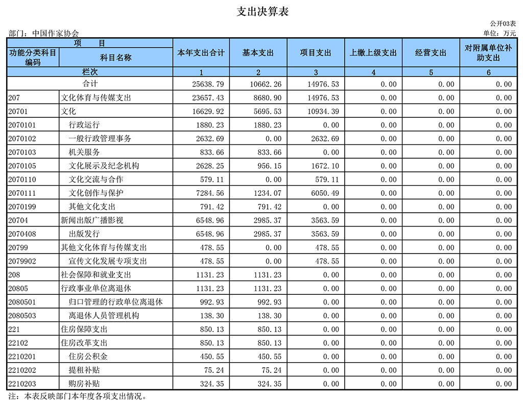 七、文化體育與傳媒(類)文化(款)行政運行(項):指中國作協本級行政人員工資及機構正常運轉、履行職責所需的基本支出。