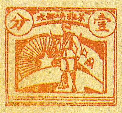 最早出現在郵票上的人民軍隊形象,是對第一次國內革命戰爭時期的紅軍戰士的刻畫——1932年,中華蘇維埃共和國郵政發行第一套郵票,7枚郵圖上有題為“戰士圖”和“沖鋒圖”的圖案。紅軍戰士持槍(圖②)與沖鋒的形象,第一次出現在郵票上。這套郵票,在普通的白紙和報紙上,以石印版印制,票面粗糙,沒有齒孔,卻是表現人民軍隊形象最早的郵票。1990年,在“中國人民革命戰爭時期郵票發行60周年”紀念郵票中,郵圖利用“票中票”形式,讓人們再次領略了紅軍戰士的風采。
