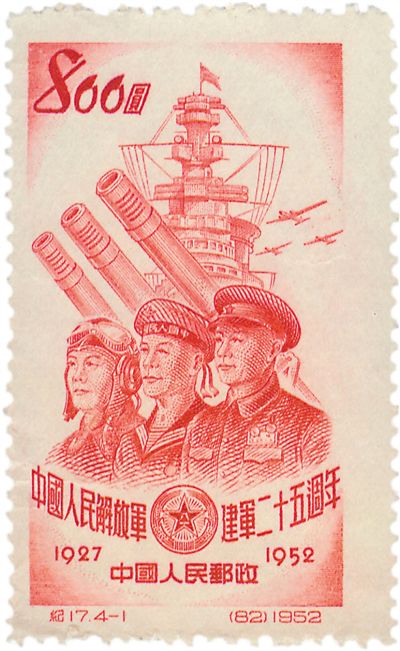 1952年8月1日,中國人民郵政發行“建軍25周年”4枚紀念郵票,以陸、海、空三軍將士的總體與個體形象,以及大炮、軍艦、飛機等當年的武器裝備,再現了解放初期人民軍隊的建制與實力,以及剛剛經歷戰爭考驗的驍勇的軍旅形象(圖⑤)。新中國成立后發行的這第一套建軍紀念郵票,與5年后發行的“建軍30周年”紀念郵票一樣,郵圖以雕刻版單色印制,畫風樸質,時代感強。