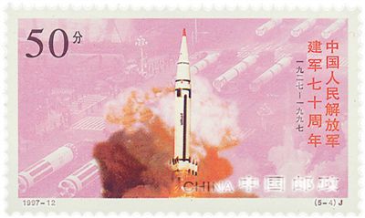 1997年發行的建軍紀念郵票,以五個篇幅謳歌了軍隊的現代化建設(其一見圖⑦)。在即將進入新世紀,香港剛剛回歸祖國之時,郵圖以簡潔直觀的真實畫面,再現了經歷了70春秋的砥礪前行,走向現代化和已經現代化的這支偉大的武裝力量。