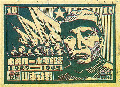 1945年10月,山東解放區的山東戰時郵務總局發行了第一枚“中共八一建軍紀念”郵票(圖⑨)。這一枚郵票,主圖是朱德總司令威嚴的戎裝肖像,背景是軍旗引導下的軍隊行進。主圖之外的邊飾,印有“中共八一建軍紀念”“1927—1945”和“山東戰郵”的字樣。