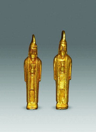 我們為一些來自中國以外地區的展品也配上了我館的藏品加以比照說明,這一部分以我館收藏的絲綢之路古代國家錢幣為主。比如第五十六號展品,來自印度的濕婆和雪山神女像,我們就配上了館藏的貴霜王朝波調一世金幣,顯示了貴霜王朝時期濕婆信仰在中亞地區的影響。又比如第四十三號展品:阿卜杜勒·馬利克金幣,這種由阿卜杜勒·馬利克在七世紀創造的摒棄哈里發形象、僅以《古蘭經》箴言文字作為裝飾的錢幣新樣式,一直沿用到二十世紀初。我們為它配上了館藏的蒙古帝國成吉思汗金幣,雖然金幣是晚至十三世紀初鑄造的,但像這樣標明大汗全名和制造地、年份等信息的金幣,極為罕見珍貴。又比如第二十五號展品:奧克蘇斯的瑣羅亞斯德教徒像,我們就配上了館藏的安息王朝阿薩西斯一世銀幣,銀幣年代晚于教徒像,我們想通過銀幣上安息帝國國王頭戴的風帽,展示塞族人的風帽→教徒像上的風帽→安息國王頭上的風帽這樣一條影響鏈條,最終說明塞族人文化對伊朗高原的影響。