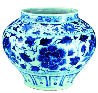 上博:是的。再比如第六十七號展品:元青花盤,形制規整精巧,花紋繁復縝密,色彩幽菁可愛,是元青花瓷器中的精品。但是如果記性好一點的觀眾就會發現,大英博物館的這件元青花盤在2012年上海博物館舉辦元青花瓷器大展時就已經來過上海了,此次再來,可見其在大英博物館中的重要地位。我們配上了館藏的元青花纏枝牡丹紋罐,相比之下,呈現的是相對活潑的風格。