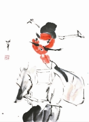 葛水平一面寫作,一面畫畫,文學與藝術的雙重推衍,啟開“我之為我,自有我在”的天性。她的畫與傳統的文人畫有著明顯的距離,徑自呈現出一種鮮活趣味;尤以山鬼系列頗具野獸派畫風。作為符號形式映現原始人類圖騰崇拜的山鬼,在職業畫家那里是美輪美奐的仙妖化身,在葛水平筆下卻是頭插山花、豐乳肥臀的村婦,全然沉浸于自得其樂的喜悅,靜寂里發散出一股莫名的熱情。角色內心活動的特殊肢體語言,不掖不藏,明明白白;筆墨明快飽滿,透著厚實的生命力。