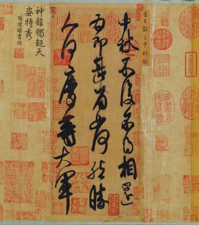 《快雪時晴帖》 是晉朝書法家王羲之的書法作品,以行書寫成,紙本墨跡?!犊煅r晴帖》 是一封書札,其內容是作者寫他在大雪初晴時的愉快心情及對親朋的問候,收藏于臺北故宮博物院。王獻之 《中秋帖》 又名《十二月帖》,以草書寫成,現存北京故宮博物院。王珣 《伯遠帖》 以行書寫成,現藏于北京故宮博物院?!吨星锾?和 《伯遠帖》 在清末溥儀出宮時被帶出紫禁城,后來輾轉流傳在外,1950年購回交與北京故宮博物院收藏。