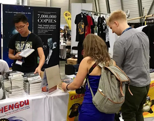 據在世界科幻大會現場的未來事務管理局合伙人“兔子瞧”介紹,《科幻世界》在市集的展位后豎起劉慈欣的巨幅海報,贈送印刷精美的《中國科幻》手冊。8月11日下午簽售結束后,《三體》英文版已經銷售一空。未來事務管理局在Regional con區域的展位上介紹中國科幻作家和科幻圈文化,發出明年4月亞太地區首個科幻大會——APSFcon的邀請,和世界各地趕來的科幻雜志編輯、作者和活動家相認。其余的中國代表團在報告廳、餐廳和展區之間忙碌地游移,10日晚上的中國科幻派對人山人海,這幾天,每場有關中國科幻的小組都人數爆滿。