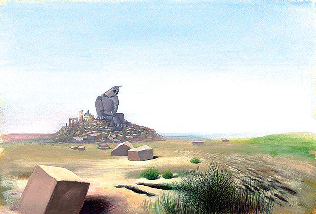 影片的結尾更令人深思:小鳥成功駕馭著機器人將國王夏爾十六扔到了千里之外。塔基卡迪王國的一切都被夷為平地,放眼望去,一片荒蕪,飛舞著的塵埃輕輕撞擊著廢墟。一切都消失了,小鳥、牧羊女、掃煙囪的人、獅子、老虎以及其他被奴役的人……他們全都不見了。惟一守護在廢墟旁的是巨大的機器人。一只鳥籠在它的手邊,沉思的機器人用盡力氣砸碎了牢籠,釋放了這只小鳥。