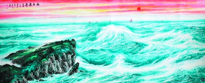 功夫不負有心人,經過幾十年的艱辛探索和執著實踐,周智慧終于創造出了自己獨特的“海派風格”。中國人自古就重視生命,而藝術則是中國人在更高層次上展開自己生命的載體。以生命擁抱生命,以生命開拓生命,以生命超越生命,蘊涵著熱愛生命、熱愛自然的“生生不息”的濃厚人文精神。周智慧與大海結下不解之緣,海的奔騰與他的血脈相連,他的心胸已納百川。他形容自己是“傻”“癡”“瘋”:“傻”是心無旁騖,不計得失,一心為畫;“癡”是不知饑飽,癡迷于畫中;“瘋”是只要拿起畫筆,不計晨昏。他沉浸在自己的海洋世界里,不斷開拓和超越自己的人生境界。他崇尚大境界、大美術、大語言,他把大海的博大與壯美發揮到了極致。站在他的畫前,你會感到宇宙的無限,大海的神奇;你會感受到一種涌動的熱情和博愛;你會豁然開朗,思緒萬千,猶如大海奏擊出的藍色交響曲,給人類留下美好,讓世界充滿愛……