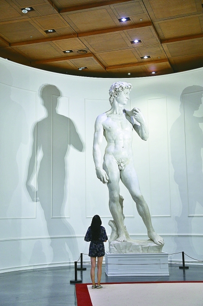 過了一會兒,他給記者發來微信:“我剛才說錯了,看到后面感覺太好了?!闭箯d往里走,可以看到米開朗基羅《創世紀》濕壁畫的臨摹作品、古紙復制素描,以及《圣殤》《酒神》等翻模雕塑,其中尤為醒目的《大衛》雕像為世界上僅存三件之一的1∶1原模復刻。這位學了三年雕塑專業的大學生說:“近距離觀察,能看清線條的作用、素描的節奏,看清雕塑上的起伏和深度,這是靠圖片或講解體會不到的。我覺得原作也好,復制品也好,其根本價值在于內容,不必太過糾結于形式?!?/p>
