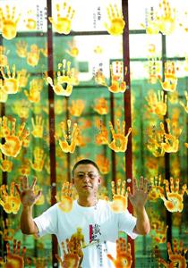 圖為樊建川在老兵手印廣場。這個廣場是他征集了4000多枚抗戰老兵手印建成的。他說,正是這些當年揮舞大刀長矛、擲手榴彈、埋地雷的手,擋住了來勢洶洶的日本侵略軍,力挽狂瀾,這些功勛卓著的手應該留下來。