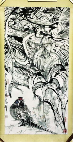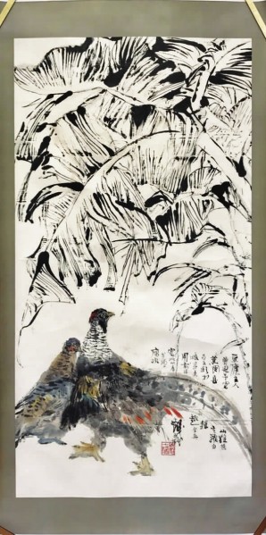 一個星期后,發老來封短信,讓我有空去他家里。隔日,我去了。發老借租的一棟三層小樓里,住了好幾戶人家,都是美術系統的“革命群眾”,只有發老一人是墨墨黑的“黑畫家”。夏天,因為要通風,門窗都開著,發老十分謹慎,踱到這扇門外張一張,又去那扇門外望一望,確定沒人,便迅疾地從床席子下面拿出一封信,說:“這里面就是你那天‘黑畫展’上看到的,按那意思畫的。你回去再打開看?!被氐郊依?,我便迫不及待地打開觀賞。畫得真好,但總是沒有“黑畫展”上那張畫彰顯的肆無忌憚、目空一切的雄渾奇氣 (下圖右)。過了幾天,我到發老家去,“發老,謝謝您啊,那張畫畫得非常好,但我總感覺‘黑畫展’里的那張更好?!卑l老說:“這張你先拿著,將來如果有一天,云開日出,那張畫能發還給我的話,我還送給你?!?978年,發老終于得到平反,恢復了黨籍,當時那批被批判的“黑畫”也統統發還給他。發老毫不猶豫地將那些畫作捐給了畫院,唯獨將那四尺整張 《芭蕉錦雞圖》贈予了我。這前后兩張 《芭蕉錦雞圖》可是要“子子孫孫永寶之”的。