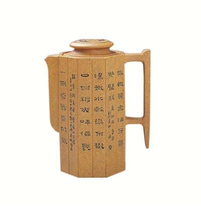 宜興市,古稱“荊邑”、“陽羨”,是中國著名陶都。宜興素有“陶的古都,洞的世界,茶的綠洲,竹的海洋”之稱。尤其是“荊溪十景”,自古以來,就吸引無數文人墨客在那里留下了贊美的詩篇。對于喜愛傳統文化的鮑志強來說,他用創新的手法將這些詩文、風景畫與紫砂結合在一起,產生了一個新的系列——“荊溪十景”。這一系列作品中的紫砂壺,壺身比傳統的形制大一些,近看會發現有詩文題字,旁邊又有山水畫,印象深刻。