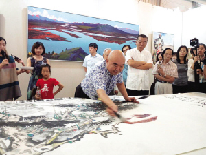 五國藝術家在活動現場共同創作巨幅作品《山水相連》。孫文振攝
