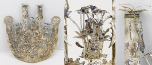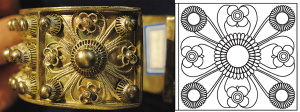 手鐲兩端的局部紋樣也頗具匠心:在使用了與主體部分相呼應的乳丁元素的基礎上,還運用纖細的銀絲勾勒出局部的特殊花朵造型,使局部在不影響整體和諧融洽的前提下,又不失個性。變化與統一并存的裝飾效果,打破統一所造成的沉悶感,增添了手鐲造型的豐富性和視覺的層次感。當手鐲表面的線性成分引導著人們的視線向兩邊延伸時,手鐲兩端的局部紋樣猶如形成了一種界限,產生了視覺上“盡頭”。這個“盡頭”將反復排列的乳丁元素和人們的視覺范圍,控制在了一個適當的“度”內,避免了裝飾元素過度重復所引發的乏味感和肆意蔓延導致的無序感。