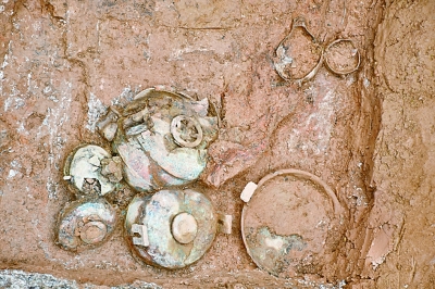 此次發掘的兩墓墓葬形制均為口大底小的豎穴土坑墓,平面呈長方形,東西向。在M4墓室的棺內發現人骨一具,保存狀況較差,僅存牙齒數顆。出土的器物有陶、銅、金、漆、石、骨器等。其中,陶器有高領折肩壺2件、侈口小罐1件,銅器有帶蓋鼎2件、帶蓋豆2件,舟、盤、匜各1件,銅盤之下放置2件車軎,銅舟下出土金箔1片,另有石圭1組、骨管1件、祭骨1具(應為狗)。M6墓室內的葬具為一槨兩棺,人骨保存較差,但出土的器物非常全面,有陶、銅、金、玉等各類器物150余件。其中,隨葬銅容器21件,銅編鐘一組9件,石編磬一組10件;陶器6件;銅兵器有戈、劍、鏃;還有車軎、鈴、馬銜等車馬器,鑿、錛類銅工具,漆器、金飾、石圭、玉圭、玉飾及各類貝串飾等。