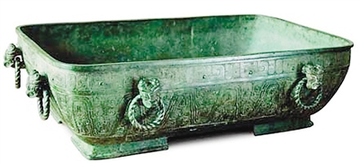 原始初民的浴具以實用為主,但也不乏審美元素,各類浴具上往往刻有各類幾何紋,直線、曲線、水紋、三角紋、漩渦紋、鋸齒紋等等?,F存最古老的浴器“虢季子白盤”,青銅質地,盤口呈圓角長方形,曲尺形足,飾有波曲紋,沉雄厚實,線條雄健。春秋到兩漢時期的浴具,無用之用的美學功能更加凸顯。如吳王夫差鑒,兩側口沿旁刻有兩只小龍,前足在口沿,后足蹬著器壁,作探頭狀,如同窺浴,神氣活現,生動活潑,充滿了生活情趣。還有一些浴具如陶杅、沐盤等往往飾以貝紋、蟠螭紋、夔紋等紋飾,裝飾繁復華麗,姿態萬千,簡直就是觀賞藝術品。