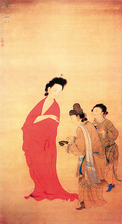 “貴妃出浴”在詩詞中也數不勝數?!按汉n浴華清池,溫泉水滑洗凝脂。侍兒扶起嬌無力,始是新承恩澤時?!保ò拙右住堕L恨歌》)“簾影罷添新翡翠,露華猶濕舊珠璣?!保ㄐ焘埂度A清宮》)“百媚千嬌出浴時,君王凝盼轉魂迷?!保ㄖ芏顺肌额}真妃出浴圖》)“溫泉暖滑留余香,芙蓉出水紅生光?!保ㄒγ恪额}楊妃出浴圖》)“出浴太真冰作影,捧心西子玉為魂?!保ú苎┣邸都t樓夢》)……這些都是膾炙人口的佳句?!百F妃出浴”從唐經由宋后,從對人體美的贊譽一躍成為“至美”的代名詞。如明代戲劇家朱權贊王實甫《西廂記》時說:“王實甫之詞如花間美人,鋪敘委婉,深得騷人之趣。極有佳句,若玉環之出浴華清,綠珠之采蓮洛蒲?!保ā短驼糇V》)正是用“貴妃出浴”來喻指文章之妙,得句之佳。