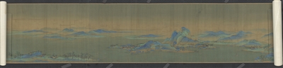 《千里江山圖》(下圖為局部圖)為北宋王希孟所畫,高51.5厘米,長1191.5厘米,用的是一匹整絹。全卷取法唐代李思訓、李昭道父子的青綠山水,主要用石青石綠,淡色渲染高空和水面,在山腳和半空露出絹本底色,顯出陽光燦爛之感。全幅構圖景象開闊,屬于北方山水畫派的系列,以散點透視橫向展開全景式大山大水,氣勢宏大。圖中的臺榭樓閣和橋亭、村落、寺觀等建筑類型以及船舶等均十分豐富,與自然山川有機結合起來,形成視覺重點。