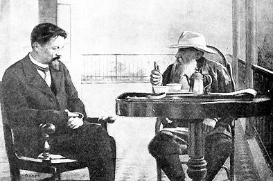 在1957年上海人民美術出版社出版的《契訶夫畫傳》中,有這樣一幅照片:一個簡樸的陽臺,桌上放著小小杯盞,托爾斯泰似乎在向契訶夫“訓示”著什么,后者謙卑地將雙手交叉在一起,高大的身體佝僂著,低著腦袋,朝他的方向傾聽著,像是一個溫順的農婦。這是契訶夫為數不多的對托爾斯泰的拜訪景象之一。它讓人想起契訶夫成名后的那句話:如果托爾斯泰還活在這個世界上,我就覺得有依靠,即使自己寫不出什么,也讓我感到安穩。如今,眼前坐著的,就是一個可以籠罩他文學事業的藝術上的巨人。很顯然,他的溫順,讓這樣一個同樣欣賞他才華的強者感到高興: