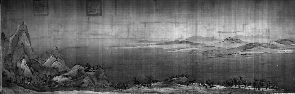 畫中一座座突兀的高山大嶺佇立在大江大湖邊,山勢雄秀,群峰簇擁主峰,據考證,類似這樣的地質地貌,極可能是贛北鄱陽湖與廬山。全圖系傳統的散點透視,群山均非概念化的排列,經過總體把握和周密布局,由七大組群山組成,像是某個具體地域的山勢作橫向展開,重現七次,每組都將主峰和諸多輔峰組合起來,如同一座座山島矗立在江邊湖畔,形成互有聯系的“島鏈”。這種觀察、組合群山的方式與畫家在江南的生活體驗有關。卷首第一組為序曲,該組和第二組之間以小橋相接,第三組和第四組之間以長橋相連,最高的主峰似廬山漢陽峰在第五組,拔地而起,成全卷的高潮。最后一組如同音樂的尾聲,節奏感十分鮮明。每一組群山不是作簡單循環,都出現了許多新的變化,如變換山體造型、增換瀑布和溪流以及建筑群,如同樂曲中的“變奏”。