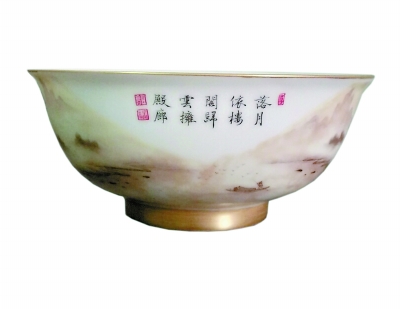 琺瑯彩瓷器中的山水樓閣是常見的表現手法,傳世稀少,十分珍貴。雍正琺瑯彩墨彩山水樓閣人物碗是很有代表性的一件。所謂墨彩,是在白地上繪黑彩。通常以黑地繪五彩或三彩的叫黑彩,墨彩所呈現的簡約、單純、嫻靜使這種瓷器達到應得的效果。