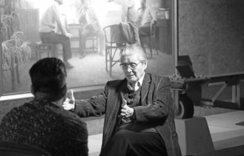 表演藝術家藍天野接受《百年巨匠》攝制組采訪。資料圖片