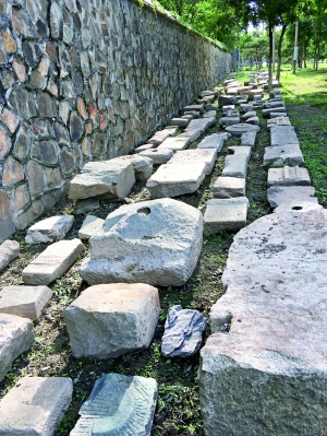 在緊挨南墻的墻根下,綿延20多米的虎皮石、石構件、城磚等文物,“筑”成了一道壯觀的“文物長城”(右圖)?!半S著圓明園周邊區域的搬遷騰退,我們從2015年開始專門成立了文物回收工作組,目前已經從圓明園周邊地區收回8萬余件文物,一塊磚、一方條石、一件柱礎就算一件文物?!眻A明園管理處文物考古科科長陳輝告訴北京晨報記者。