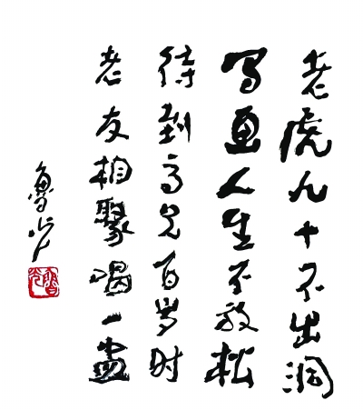 頭一回拜訪,我為他寫了一篇短文《紅色漢子高莽》。過了幾年,高莽搬到了農光里小區。因為高莽夫婦都屬虎,高莽戲稱自己的家為“老虎洞”。畫友古干用現代書法題寫了“老虎洞”三個字,他掛在客廳門楣上方。兩家住得近了,我去得就勤了,有時半個月就光顧兩三回。每次去訪,高莽都為我畫像。他長我十歲,學問更在我之上,但每次在畫上都會寫些如“牛哥”、“魯光兄”之類的謙遜之詞。