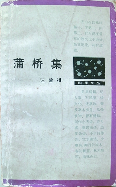 他曾對漓江出版社的《汪曾祺自選集》(1987年10月出版)發表過一通很妙的議論。他剛拿到此書時,對送書上門的聶震寧說:“藍配紫,臭狗屎?!保ù藭饷娴仙?,而書名中“自選集”三個大字卻是綠藍色的)。聶震寧回說:“臭狗屎就臭狗屎,反正書是好書?!边@本書初版本才印了兩千冊,汪先生怕出版社虧本,給家鄉高郵的官員寫信,看家鄉新華書店可否能訂一點,以解出版社之憂。僅此小事,也可見出汪先生的善良和善解人意,許多時候,他總是為別人著想的。我手頭的這本“自選集”,就是購于高郵縣新華書店,時間是1988年10月。