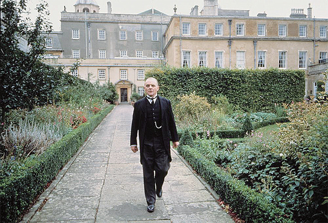 史蒂文斯口中的獲得“尊嚴”,等于是建功立業的一種修辭。為了管家的“尊嚴”,這兩次會議上,他都為了服務權貴而從親愛的人最迫切的需求面前走開,一次是彌留之際的父親,一次是哭泣著決心嫁與他人的肯頓小姐。電影做了稍許美化,前一次將彌留改為了剛剛去世,后一次增加了他在心煩意亂中摔碎酒瓶的情節。