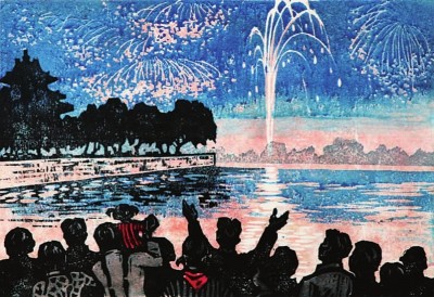 聚焦觀賞煙花,“新興木刻運動”先驅之一的李樺也曾留下作品,那是以套色版畫形式創作的 《國慶之夜》。遠處,一簇簇煙火沖上云霄,如花瓣般繽紛四落;近處,是觀賞的人們一字排開的背影,其中一位張開雙臂的男子與一個坐在大人肩頭的孩童都是點睛之筆。人群與煙花之間,隔著波光粼粼的湖水,最是讓這幅畫從一眾描繪國慶觀賞煙花的美術作品中脫穎而出,只見寧靜與祥和從一派熱鬧的氛圍中透出。