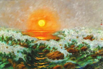 名為 《祖國頌》 的美術作品,至少有一幅國畫與一幅油畫堪稱經典。其中,經典國畫《祖國頌》 出自齊白石,既能代表藝術家大寫意花鳥的最高水平,也算得上新中國紅色經典藝術的開山作之一。1954年創作這幅作品時,白石老人已逾90歲高齡。高2.18米、寬0.725米的巨幅畫作中,所繪內容有著藝術家一以貫之的簡潔,只有一株松柏、一輪紅日、一只仙鶴、一汪湖水、一方巖石。這些事物的組合卻不簡單,不僅僅是美好寓意的累加,也不單單讓畫面巧妙擁有黃金分割般的比例,筆觸流淌出的更是一種神清氣爽、暢快自由,那是藝術家心情的真實表達。經典油畫 《祖國頌》 出自顏文樑。與齊白石的同名畫作一樣,一輪紅日依然是畫面中牽引人們視線的焦點。這輪從海平面上一躍而出的紅日,極盡寫實的油畫技法則又予人身臨其境之感。畫面令人不禁聯想起莫奈的名畫 《印象·日出》,畫中氣魄卻又讓人不免吟誦起蘇軾的名句“大江東去,浪淘盡,千古風流人物……”