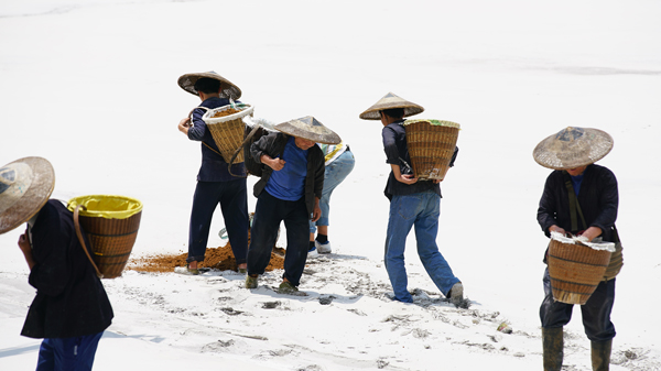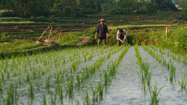 農民我是真的沒經驗,插秧之前沒弄過,我都沒見過田什么樣,不過我形體好(笑),學得快,人家都插三四根,我就插七八根五六根,就跟當地的農民學,看著他們插秧,挑擔子。