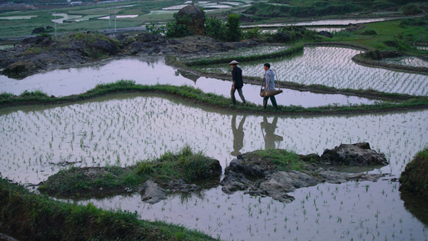 當然還是有農民很樸實的一面,有次拍戲時看到田地里放著一把城里買的那種艷麗的傘,下面坐著一個孩子在玩,旁邊還一個推車,媽媽在插秧,我看到就流淚了,丈夫在外面辛苦打工卻沒想到妻子還插著秧,管著自己的孩子和父母親,農村的女同志太不容易了,晚上還抱著孩子玩。我們都很感動,啊,農村原來是這樣的,所以我覺得這部電影的導演是經過很深入的研究和采訪,把片子寫得有骨有肉,而不是很空洞。