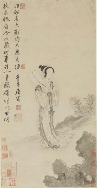 上海博物館書畫研究部主任凌利中告訴記者,新陳列中首次露面以及許久未展的展品有25件,其中最受業界關注的莫過于唐伯虎的 《秋風紈扇圖軸》?!斑@是中國古代書畫史上繞不過去的一件作品,說到唐伯虎的水墨人物畫,人們第一個想到的就是它?!绷枥姓f,在“明四家”中,唐伯虎是個性最鮮明的一個,雖有“江南第一風流才子”名號,但一生坎坷不得志?!肚镲L紈扇圖軸》 描繪了一名手持紈扇佇立在秋風中的美人,她側身凝望,眉宇間微露悵惘神色。畫軸左上角有畫家自題詩:“秋來紈扇合收藏,何事佳人重感傷,請把世情詳細看,大都誰不逐炎涼?!蓖干涑鎏埔淖試@之情。