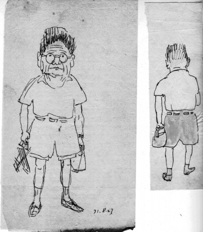 轉眼到了今年9月末,我請孔夫子網的同志來收舊書。我父親的外文書和中文書都分別捐給了社科院和現代文學館,還剩下一些馬列著作沒拿走??粗@幾箱書我犯愁,難道就當廢品處理嗎,我不忍??追蜃泳W的劉杰來看過,她認為大部分他們可以收走。我如釋重負,為這些書籍能繼續發揮作用而高興。就在他們整理圖書做書目時,意想不到的事發生了:在父親的一本舊書里,發現了高莽先生的兩幅舊作。那是在干校時高莽先生畫我父親的速寫,一幅畫正面,另一幅是背影。