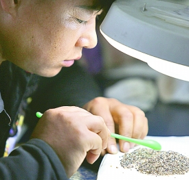 研究人員在對篩選水洗探方土樣后殘留的微小物質進行挑選。李鵬攝/光明圖片
