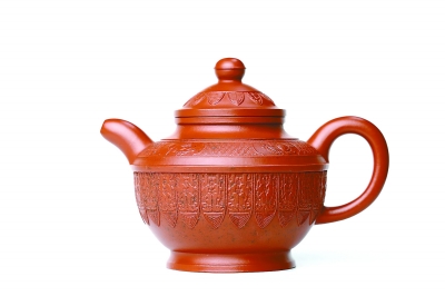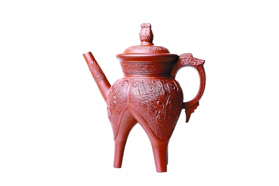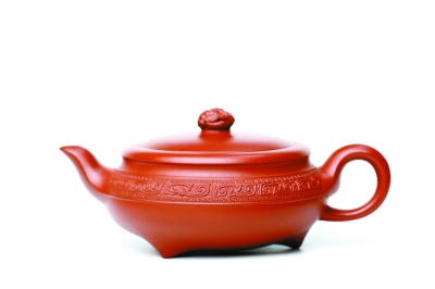 蟠壚壺的原型是“大明宣德爐”。該壺器型端莊古樸,線條流暢,質地紅潤。壺身巧飾八條夔龍紋帶,與壺鈕的鏤空云龍合數為九,象征九五至尊。它是青銅器紋飾與紫砂裝飾藝術相融合的代表作,既滿足紫砂藝術的創新要求,又完美呈現了成型工藝、裝飾工藝、材料工藝和燒制工藝的精髓,無愧于“文質并茂足可傳世的紫砂鴻寶”。