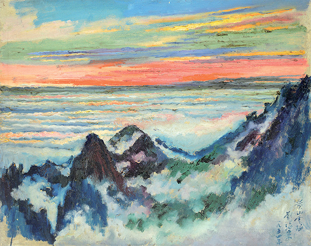展覽開幕式上,劉海粟子女將劉海粟創作的油畫《黃山云?!?、中國畫《滿庭芳(潑墨黃山)》、書法《畢竟西郊八月中》捐贈給中國美術館。展覽將持續至11月26日。圖為劉海粟1954年創作的作品《黃山云?!?。 (欣 聞)