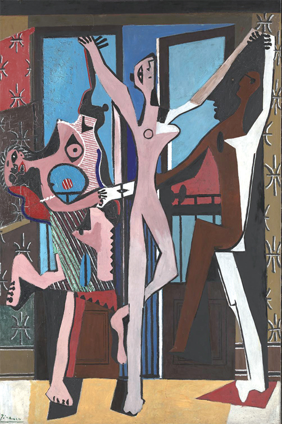 舞者們身后是通向陽臺的門。右半邊門上部是打開的,下部卻似乎還未打開。陽臺之外,可能是天空,也可能是地中海。對于立體主義來說,透視法則已經完全失效,畫家不再忠實復制肉眼所看到的東西,而是創造前所未見的視覺形式。畢加索曾說,比起《格爾尼卡》來,他更喜歡《舞蹈》這部作品,因為“它更是一幅真正的畫——一幅僅為其自身而沒有任何外部考量的畫”。也就是說,這是一幅純粹的畫,沒有文學敘事,更沒有政治宣傳目的,僅僅是舞動的線條和奇異的色塊組合。用克萊夫·貝爾的話說,這就是“有意味的形式”。
