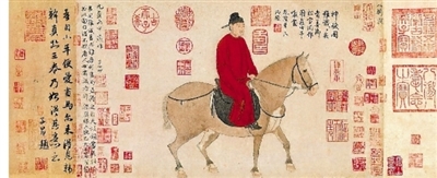 《人騎圖》的左邊有兩則趙孟頫的自題,第一則是說自己從小愛畫馬,北上后有機會見到三卷唐代畫馬高手韓干的真跡,才開始明白韓干在畫中的用意。三年后他再次題跋說畫好畫是難事,但能夠“識畫”更難。自己能把馬畫得如此好,主要是天分使然,這一幅畫自認為不愧唐人。世間能欣賞識別它的都是有眼力的人。